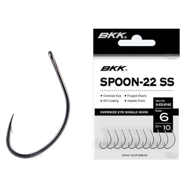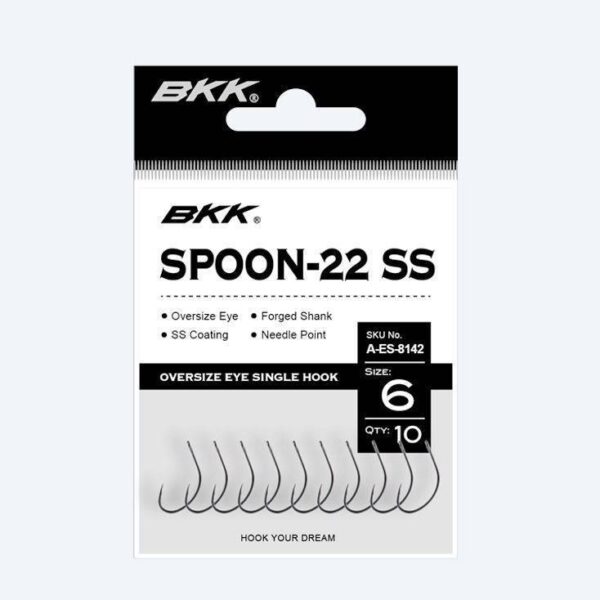 BKK SPOON-22 SS to haki doskonale nadające się do łowienia ryb łososiowatych zarówno w słodkich jak i słonych wodach. Powiększone oczko zwiększa mobilność produktu. BKK SPOON-22 SS posiadają zagięty do wnętrza grot, który zapobiega spadaniu ryb.