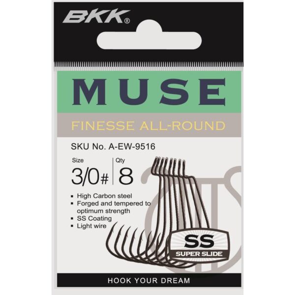 Haki offsetowe BKK Muse zostały stworzone z myślą o łowieniu gumowymi przynętami w trudnych miejscach. Bardzo cienki drut sprawia, że idealnie nadaje się do finezyjnego lub ultralekkiego łowienia, co więcej połączenie powłoki Super Slide i zakrzywionego, ostrego jak igła czubka haczyka zmniejsza opór przebijania przynęty oraz polepsza zacięcie ryby podczas brania.