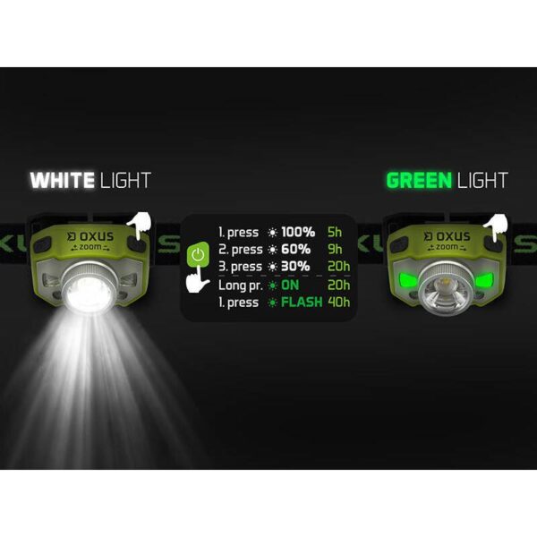 Dzięki mocy 5 W i jasności 300 lm można skupić promień światła blisko lub daleko. OXUS ZOOM posiada czujnik ruchu, dzięki czemu można ją łatwo włączyć lub wyłączyć machnięciem ręki.