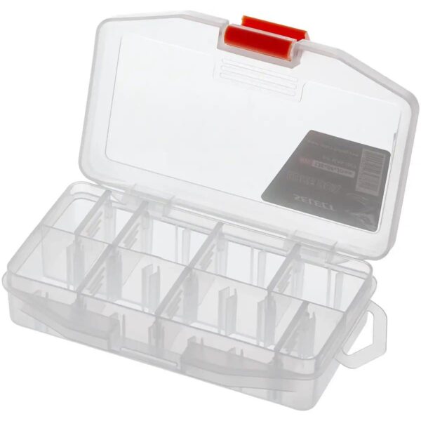 Pudełko Select Lure Box SLHS-1007 posiada 2 podłużne przegródki z kompletem wymiennych przegródek, dzięki czemu wędkarz może samodzielnie regulować ich wymiary. Górna pokrywa wyposażona jest w niezawodne zawiasy obrotowe oraz wytrzymałe zapięcie. Pudełko może służyć do przechowywania małych przynęt spinningowych, ciężarków i główek jigowych. Ze względu na niewielkie rozmiary pudełko bez problemu zmieści się w kieszeni kurtki wędkarskiej lub kamizelki, a także w nerce.