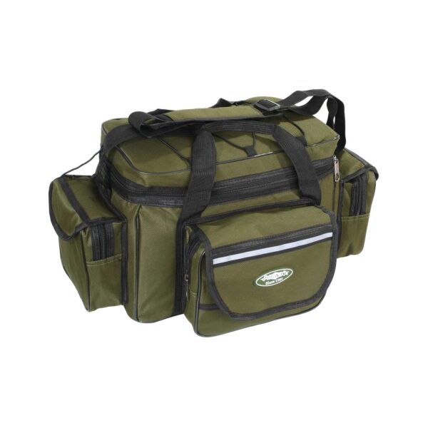 3 boczne kieszenie i 3 zasuwane schowki w klapie torby będą idealne do przechowywania pudełek z przynętami czy drobnych akcesoriów.